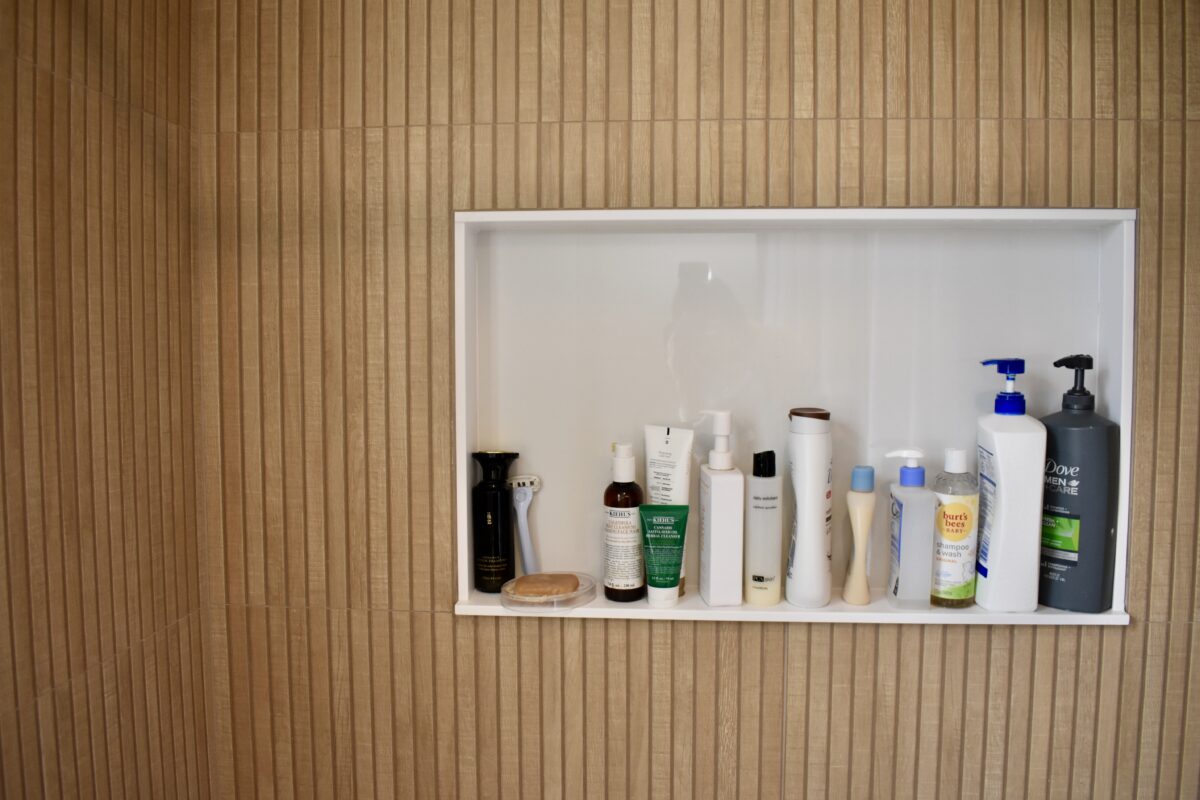 Built-in shelving and cabinetry – even in the shower
