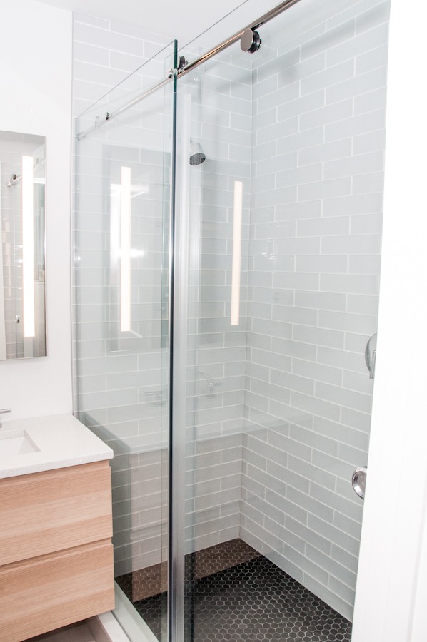 We love the black and white tile on the floors accented by the white tiles and grey grout on the walls. Simply a classic and beautiful look… what do you think?